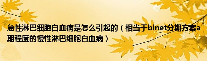 关于急性淋巴细胞白血病是怎么引起的,相当于binet分期方案a期程度的慢性淋巴细胞白血病这个很多人还不知道,今天菲菲来为大家解答以上的问题,现在让我们一起来看看吧!