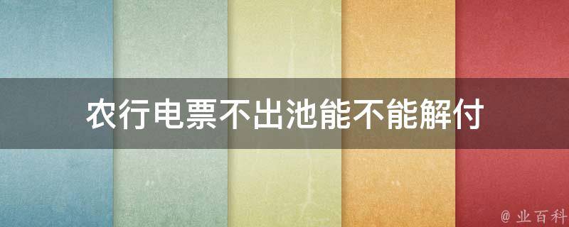 农行电票不出池不能解付,电子汇票通常是通过银行电子系统进行流转和结算的,如果电票未经出池,即未与其他金融机构进行联网对接和确认,那么在需要解付的情况下,可能无法实现支付。具体解付电票的操作和规定可能因地区、银行和相关合同的约束而有所不同。