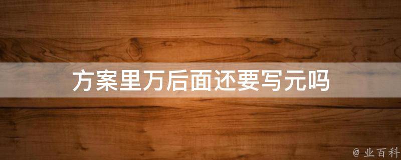 方案里万后面还要写元,如果是与钱财有关的话,万后面必须加元字,否则会引起不必要的误解。方案是从目的、要求、方式、方法、进度等都部署具体、周密,并有很强可操作性的计划。方案,即在案前得出的方法,将方法呈于案前,即为方案。