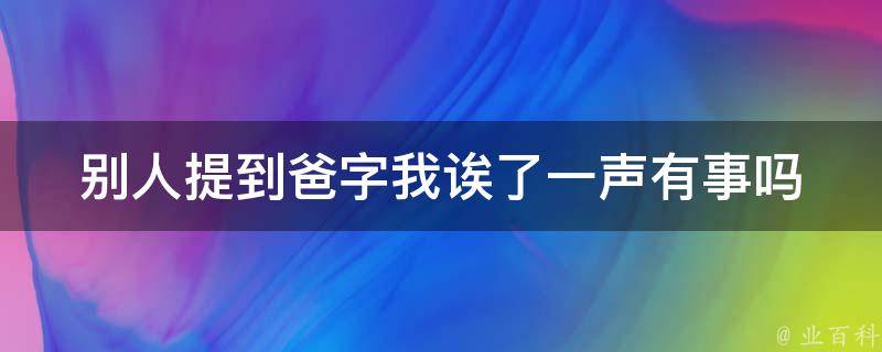 别人提到爸字我诶了一声有事,别人会生气,爸爸是直系亲属的长辈称呼,只有和自己是有血缘关系的人才可以叫,不可以随意喊别人爸爸,爸爸是儿子的保护伞,而且被叫爸爸的人也是有责任的。爸爸在家庭里的责任重大,压力也很大。他们的压力主要是通过家人的体谅、妻子的体贴、子女成功的荣耀等来释放其压力,从心理上给予被体谅关心的温暖,也可以给到被依靠的成功感。