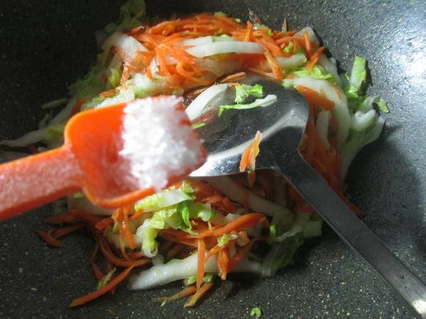 4、烧锅倒油烧热,下入切好的大白菜翻炒翻炒至断生。