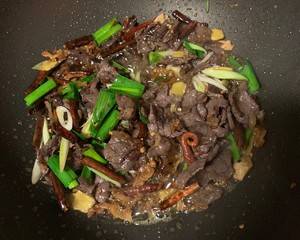 用料:牛干巴适量、蒜苗叶2根、干辣椒适量、花椒粒适量、姜片适量、料酒、鸡精。