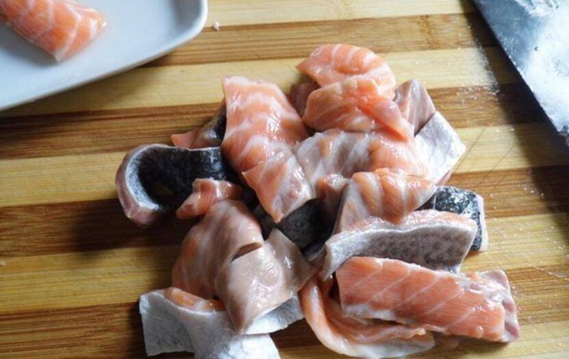 1、三文鱼去鳞切块。