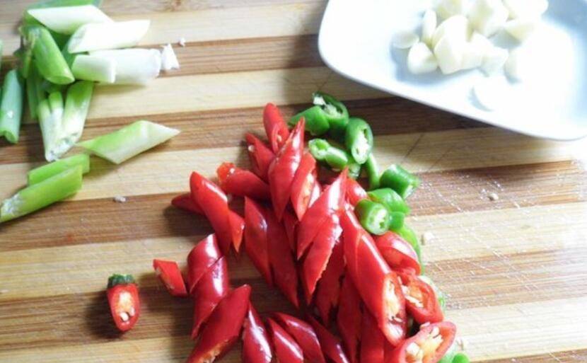 3、尖椒斜切成段,大葱切段,大蒜切片。