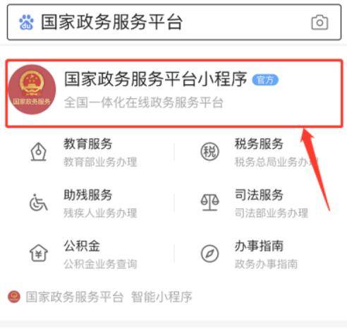 3、搜索栏输入“国家政务服务平台”找到“国家政务服务平台小程序”,点击进入。