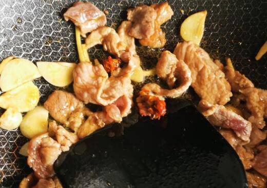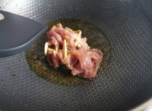 7、放入腌好的猪肉。