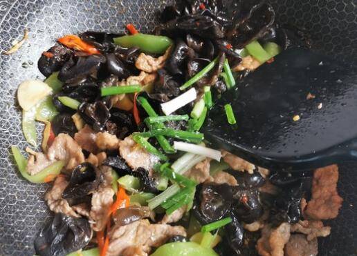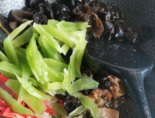9、加入木耳、莴笋、辣椒、盐翻炒均匀。