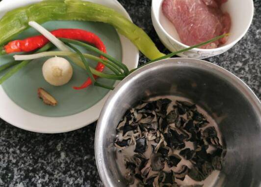 用料:猪肉150克、木耳15克、莴笋90克、辣椒两个、蒜1瓣、生姜少量、花椒粒6粒、生抽少量、淀粉少量、盐适量、鸡精少量、味精少量、豆瓣酱一勺、食用油适量、小葱一根。