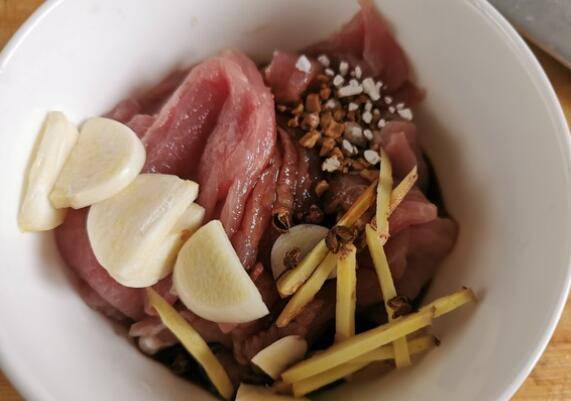 2、猪肉切片,加入蒜、生姜、花椒、淀粉、生抽拌均匀腌制。
