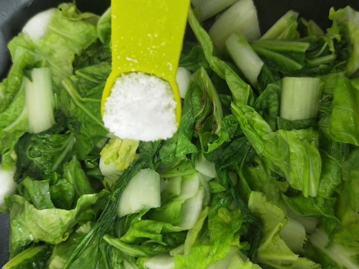 4、翻炒至明显缩水后,加入适量盐。