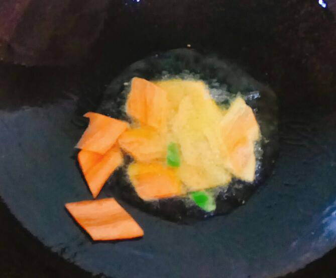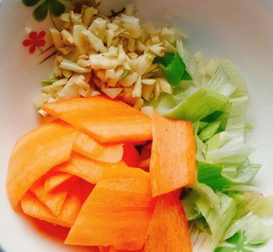 3.锅里放入油,放入葱、胡萝卜炒熟。