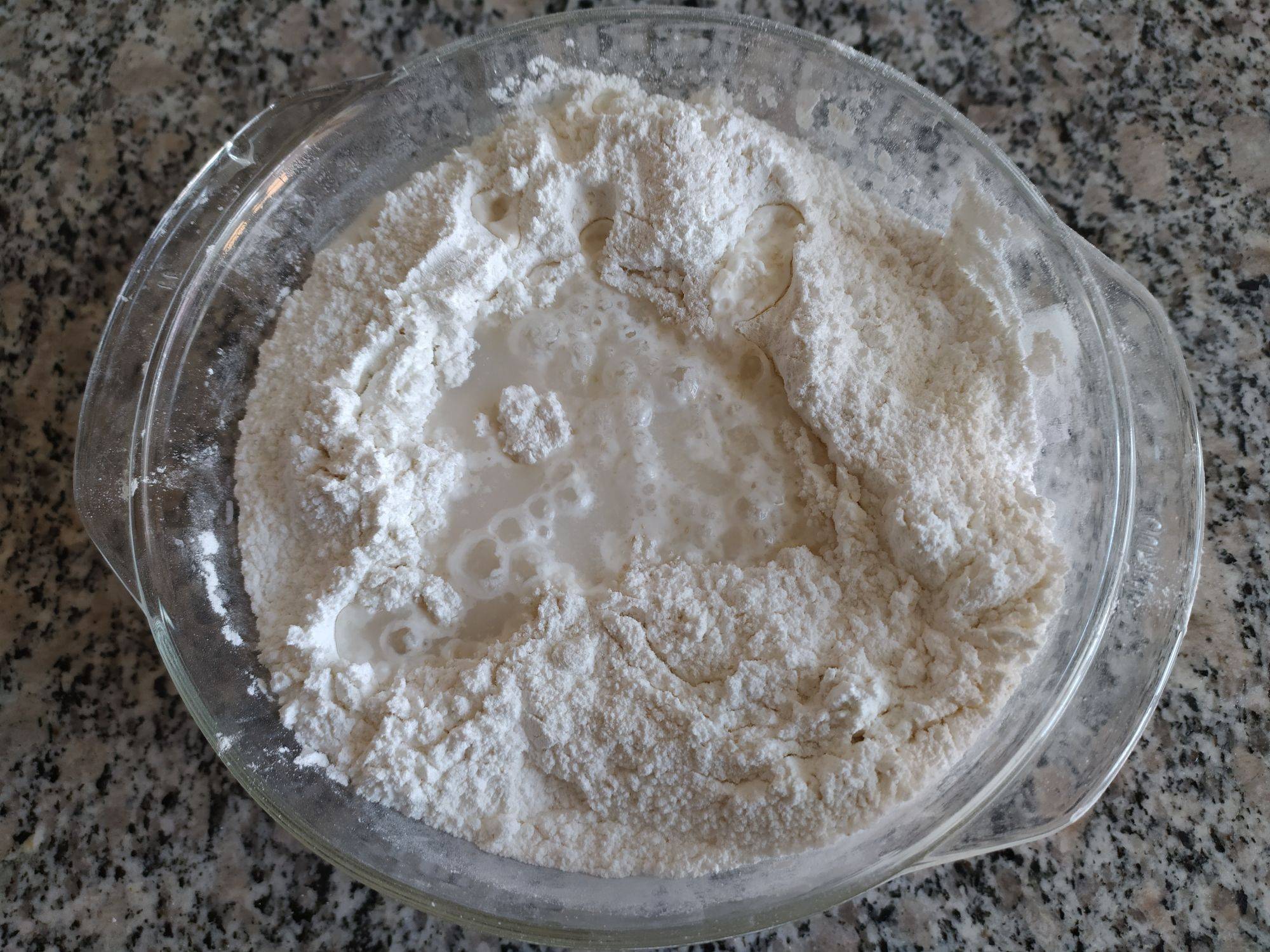 2、面粉中放入酵母、白糖、小苏打和泡打粉,加入30度的温水,和好发1个小时。