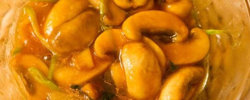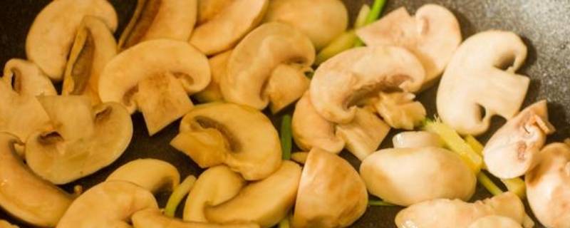 2、热油锅,倒入葱条姜片炒香,把口蘑倒进去炒熟,放入些许汤和酱油进去炒,煸炒至上色。
