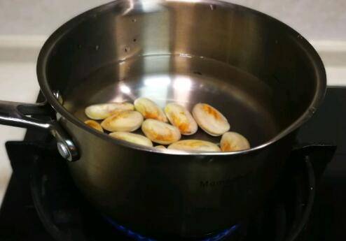 2、奶锅内加适量清水,放入菠萝蜜核。
