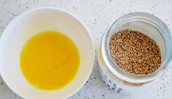 6、准备好鸡蛋液和白芝麻。