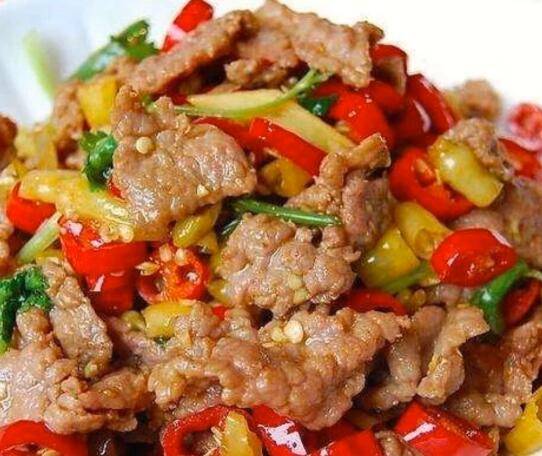 牛肉克250克、红辣椒200克、小米辣50克、芹菜3根、泡椒5个、蚝油1勺、生抽1勺、老抽半勺、米酒1勺。