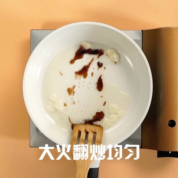 3、倒入食用油,加蒜片,蚝油、白砂糖,大火翻炒均匀。