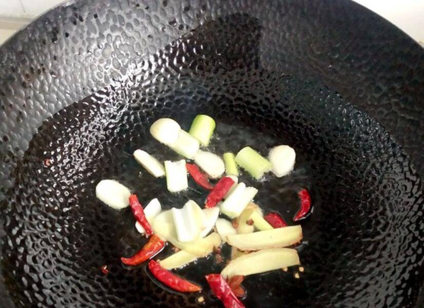 2、起锅烧油,油热放入葱姜蒜,干红辣椒,花椒煸炒出香味。