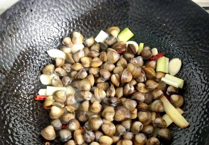 3、倒入处理好的沙蚬翻炒。