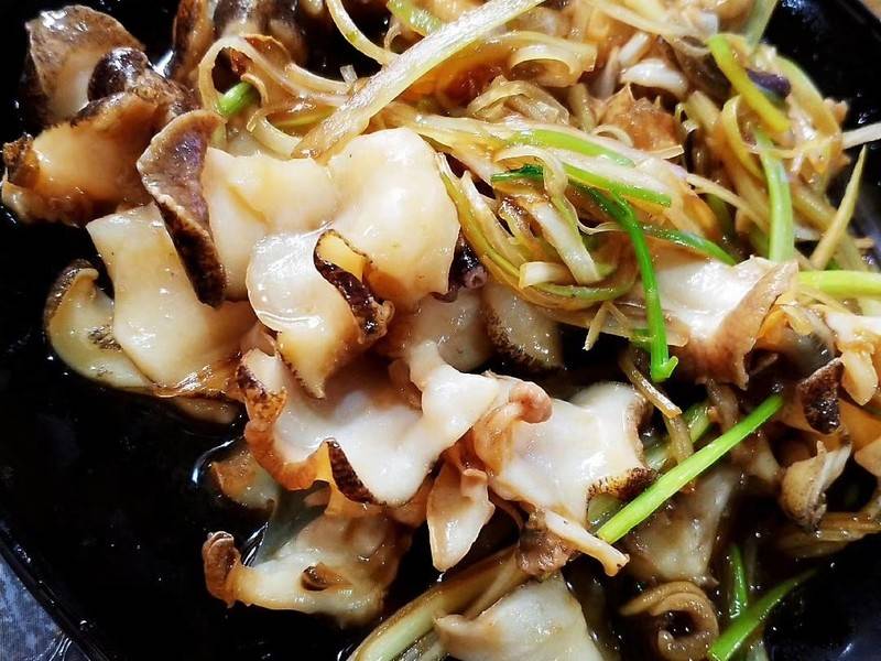 3、锅热油,炒海螺片,炒好盛出,葱丝,香菜,放海螺上,倒蒸鱼豉油,锅热油,浇上即可。