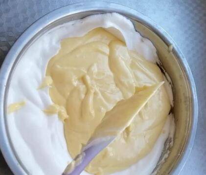 6、将翻拌好的面糊倒入剩余的蛋白中,继续翻拌均匀。