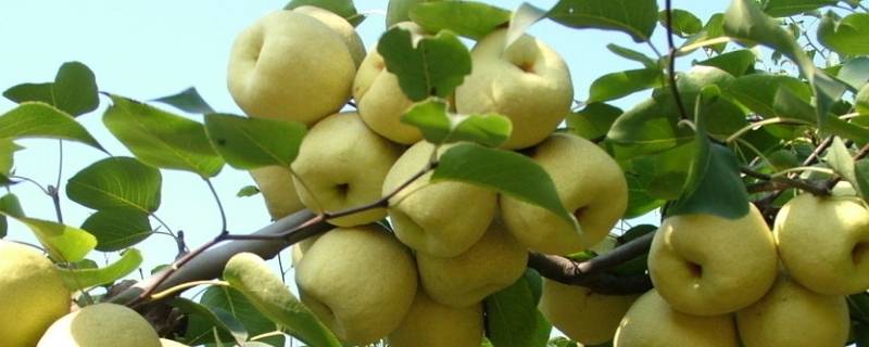 4、梨:通常品种是一种落叶乔木或灌木,极少数品种为常绿,叶片多呈卵形,大小因品种不同而各异。花为白色,或略带黄色、粉红色,有五瓣。果实形状有圆形的,也有基部较细尾部较粗的,即俗称的“梨形”。不同品种的果皮颜色大相径庭,有黄色、绿色、黄中带绿、绿中带黄、黄褐色、绿褐色、红褐色、褐色,个别品种亦有紫红色。