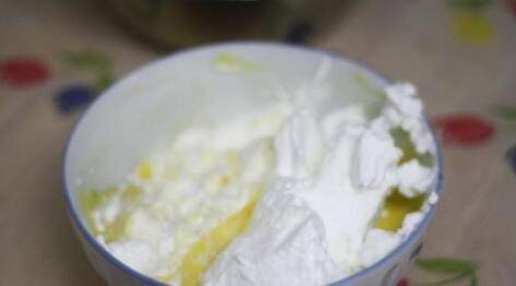 6、将1/3蛋白取出倒入蛋黄糊中,用橡皮刮刀轻轻翻拌均匀,采用切拌或者从下往上翻拌的方法。