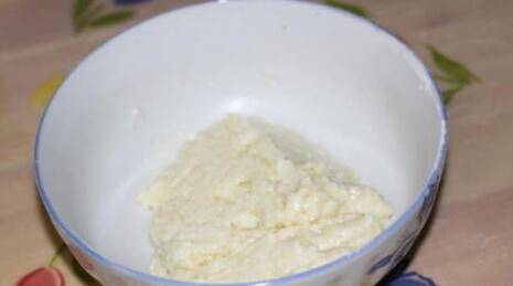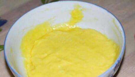 4、蛋清和蛋黄分离,将蛋黄搅拌均匀后加入过筛的面粉碗中,搅拌均匀。