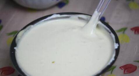2、首先将牛奶、色拉油装入无油和无水的干净盆中,用筷子搅拌至表面无大片油花状态。