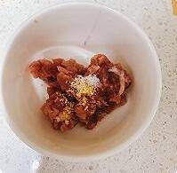 2、肉末加点盐和鸡精、油拌匀腌制片刻。