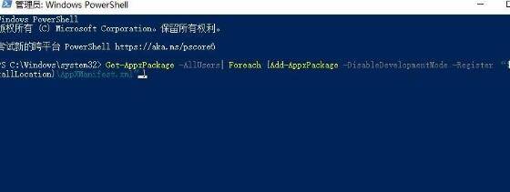 2、输入代码:Get-AppxPackage -AllUsers| Foreach {Add-AppxPackage -DisableDevelopmentMode -Register “$($_.InstallLocation)AppXManifest.xml”}。