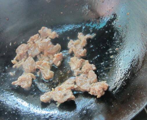 切点芹菜,茶油烧开,下入牛腩,翻炒。