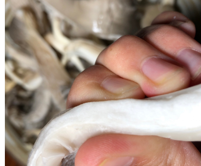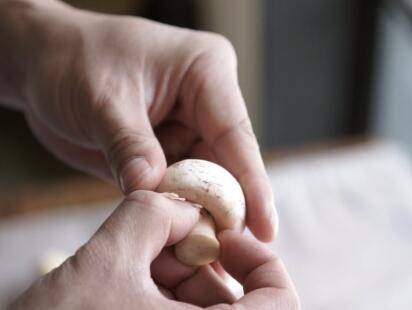 挑选饱满肥厚,菌伞根部收紧的口蘑,用拇指绕菌伞根部一圈划开连接,拔出根茎,处理干净。