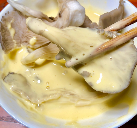 将平菇少许放入挂上面糊,挂上面糊的平菇稍微夹起将多余面糊控出,面糊裹太后容易吸油。