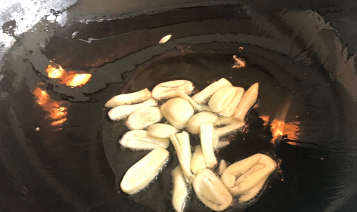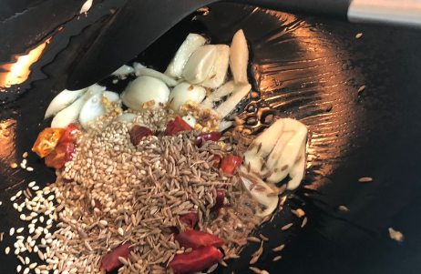 锅中倒油,将蒜片进行煸炒。倒入辣椒段,孜然,芝麻进行煸炒。