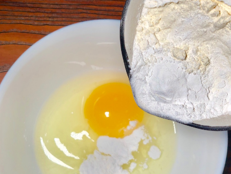 在碗里倒入备好的淀粉面粉,打入鸡蛋和少许盐搅拌均匀,少量多次添加水持续搅拌。