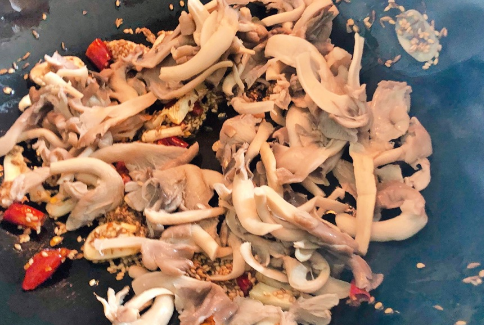 二、孜然蘑菇:平菇500克、葱段适量、干辣椒4个、孜然,辣椒面适量、食用油适量、盐少许、生抽1勺、白糖半勺、蒜3瓣。