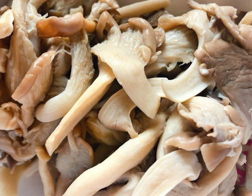 将平菇洗干净攥出里面多余水分,捏起来没有水分渗出即可,洗好的平菇平铺在案板上备用。