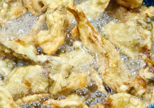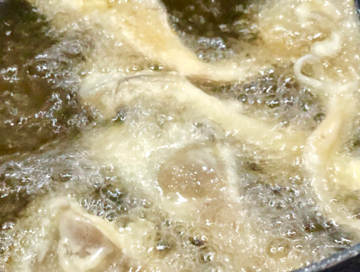 开中火锅热加入宽油,最好选用直径较小深一点的炸锅,这样比较省油。 油温烧至七成熟将挂好面糊的平菇一次一个一个用筷子夹入油锅,刚放入的时候找空间大的地方,防止平菇之间相互粘连。平菇不要全部一锅炸,要分两次受热更加均匀。