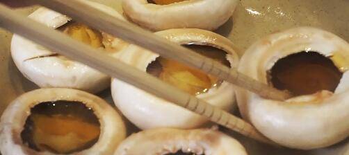 将口蘑大头向下摆入烧热的平底锅中,调成中火,蘑菇受热会自己渗出汁水。