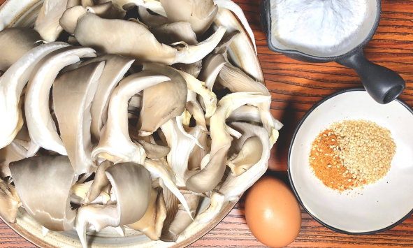 三、炸蘑菇:平菇200g、淀粉100g、面粉50g、盐1g、孜然辣椒面5g、鸡蛋1个、油适量、芝麻2g。