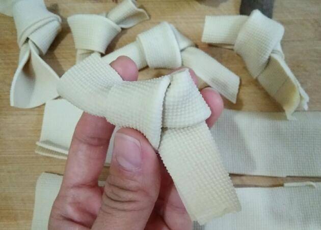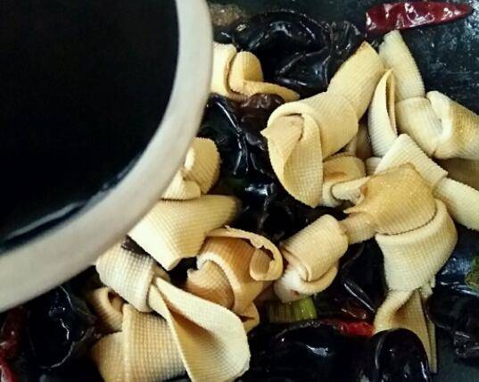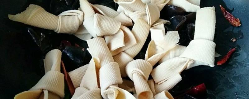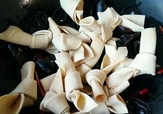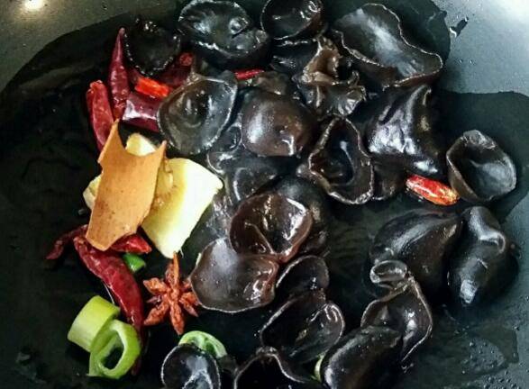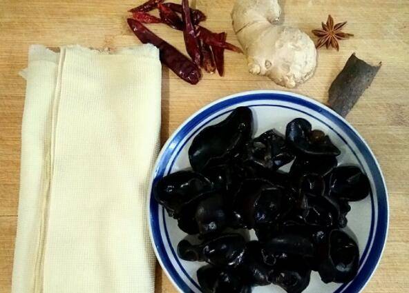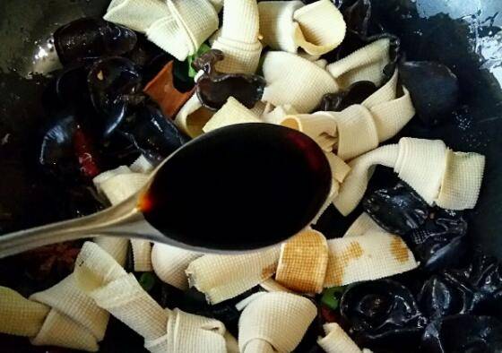 用料:千张2张、葱、姜2片、水发木耳适量、干辣椒5个、八角1个、桂皮1段、味极鲜酱油1勺、黄豆酱油半勺、蚝油1勺、高汤1碗、白糖少量。