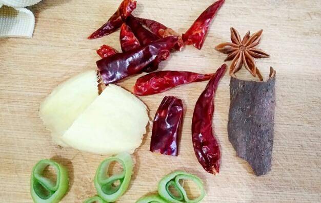 4、锅中少量油烧至7成热,下入葱、姜、干辣椒、八角、桂皮爆出香味儿。