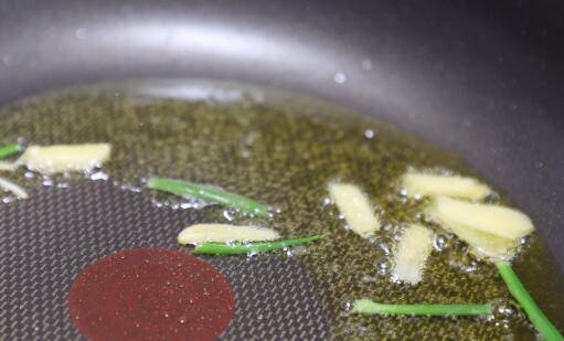 3、热锅放油,油热后放入姜片蒜段,也可先用一片姜擦一遍锅底,再倒油,可以防止煎鱼破皮。