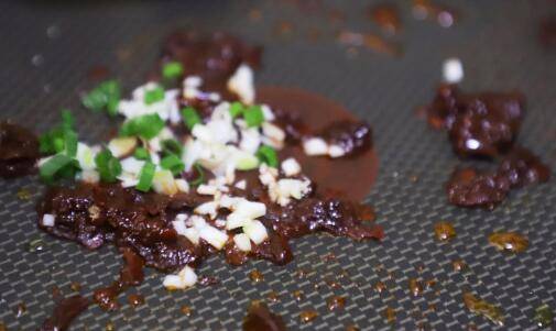 7、把大部分油倒出来,放入豆瓣酱蒜末和一半葱末炒香。