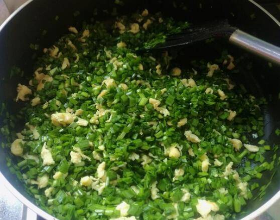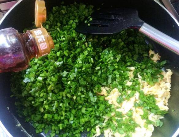 韭菜洗净切碎,和鸡蛋放在一起拌匀,用鸡蛋中的油包裹一下,可以防止韭菜出汤,也不用另外放油。加入姜末香油,搅拌均匀。