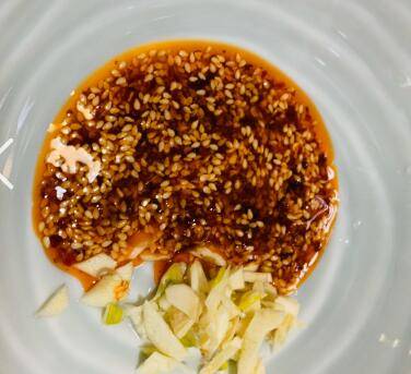 碗中加入蒜末和辣椒油,加入2勺醋、1勺生抽,根据自己的口味选择调料的量。