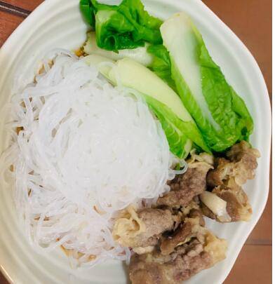 魔芋粉一包、肥牛卷6片、青菜一颗、花生米10粒、煮鸡蛋半个、蒜末适量、生抽1勺。