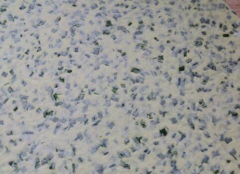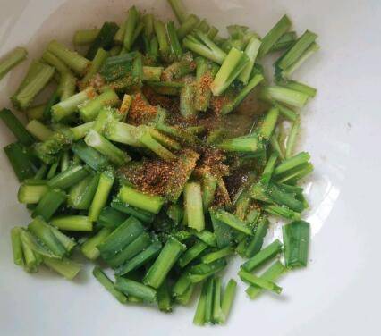 醒面的同时,把韭菜段放入碗中,加入盐、香油、十三香搅拌均匀备用。