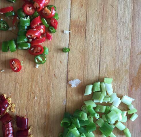 白醋、糖、盐、老抽调匀,干辣椒、香葱、青红尖椒切小段。